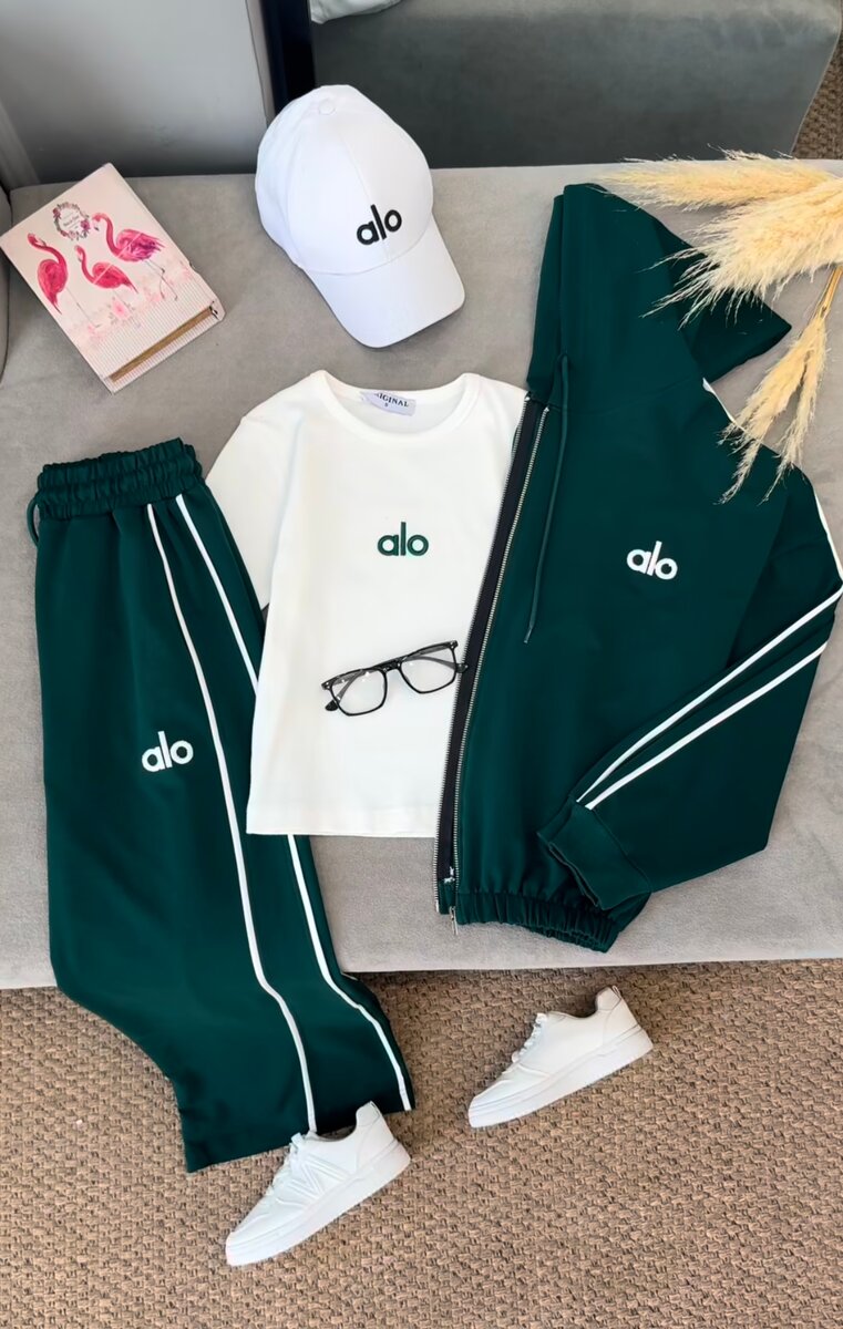 Découvrez l'ensemble de survêtement "alo", parfait pour un style décontracté moderne. Confort et élégance réunis avec son design vert et ses bandes blanches distinctives. Fabriqué avec des matériaux doux et respirants, il est idéal pour vos séances de sport ou pour une sortie relaxante. Disponible avec un haut à capuche zippé et un pantalon à taille élastique pour un ajustement parfait. Complétez votre look urbain avec ce must-have tendance!