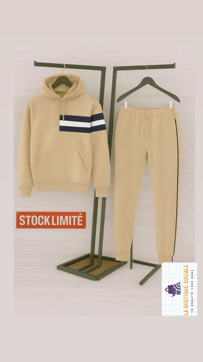 Confort et style réunis avec cet ensemble de survêtement beige, idéal pour les journées décontractées. Fabriqué en matière douce avec bande originale sur la manche, ce set comprend un sweat à capuche et un pantalon ajusté. Parfait pour la détente ou le sport.