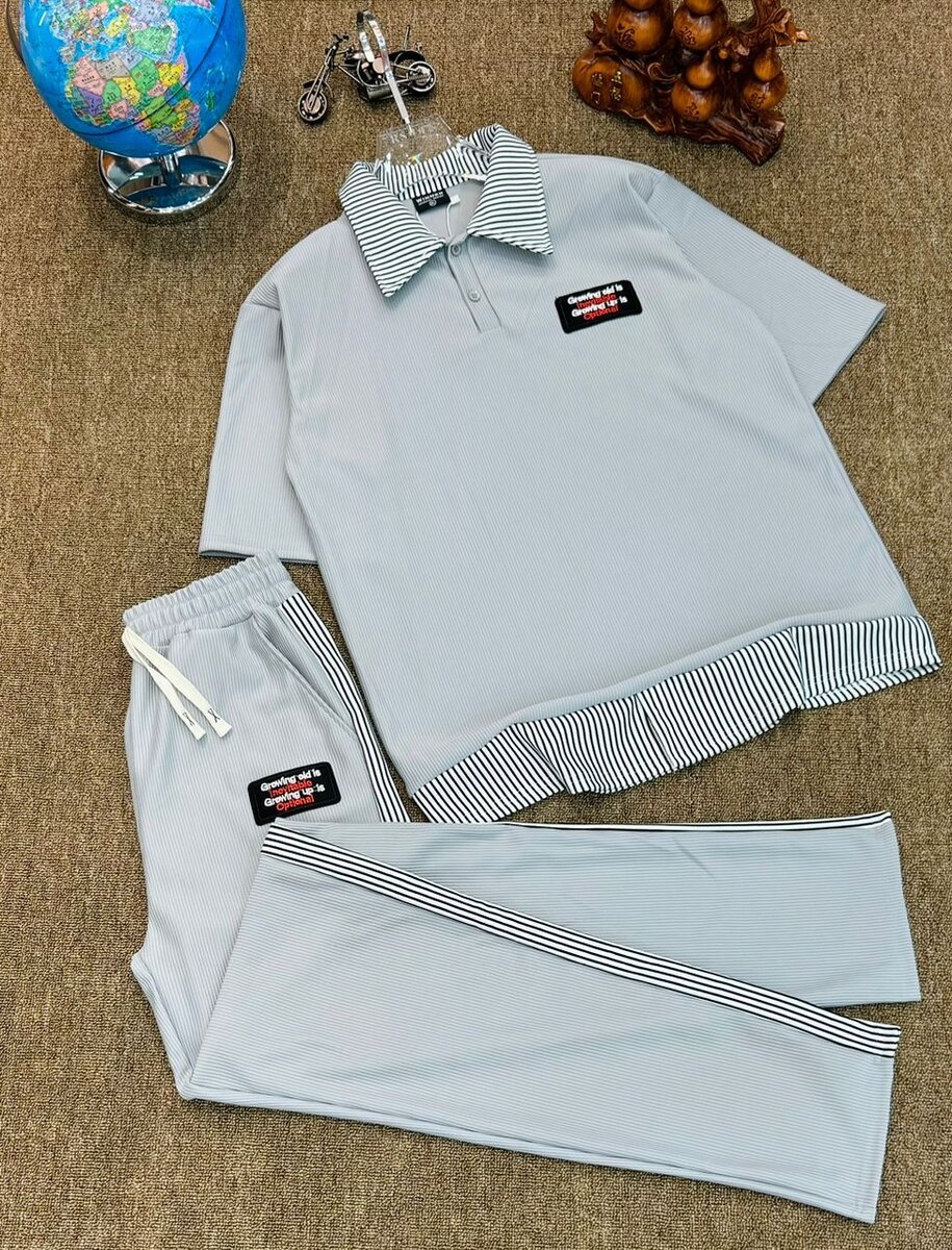 Optez pour ce confortable ensemble de survêtement gris composé d'un polo à manches courtes et d'un pantalon assorti. Parfait pour les moments de détente, il se distingue par ses détails rayés élégants. Idéal à porter à la maison ou lors de vos sorties décontractées.