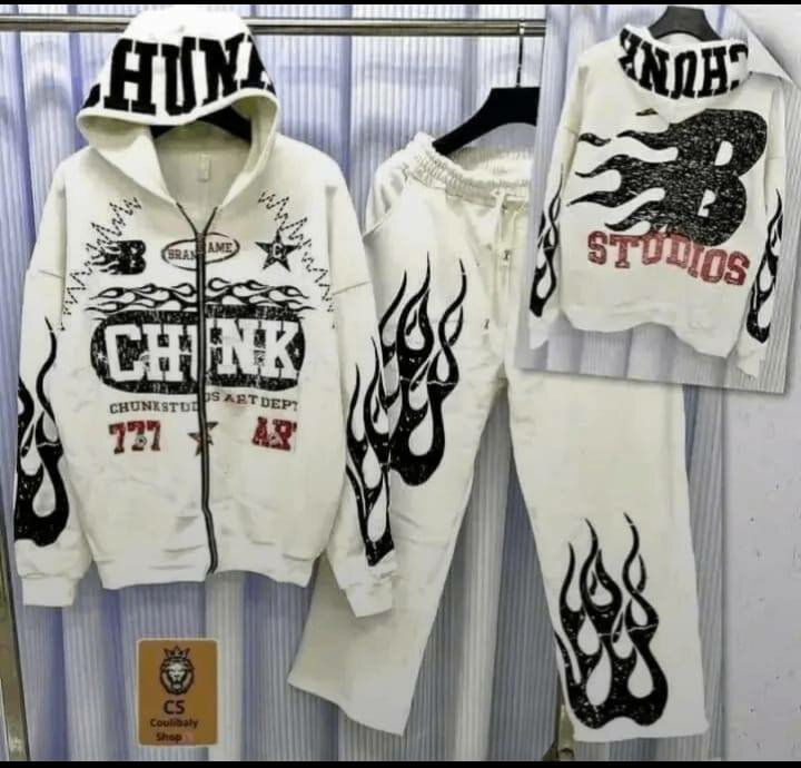 Ensemble de survêtement tendance avec motifs graphiques audacieux. Confortable et stylé, idéal pour le sport et le loisir. Fabriqué en matériaux doux et résistants, avec une capuche pratique. Parfait pour montrer votre style urbain et moderne.