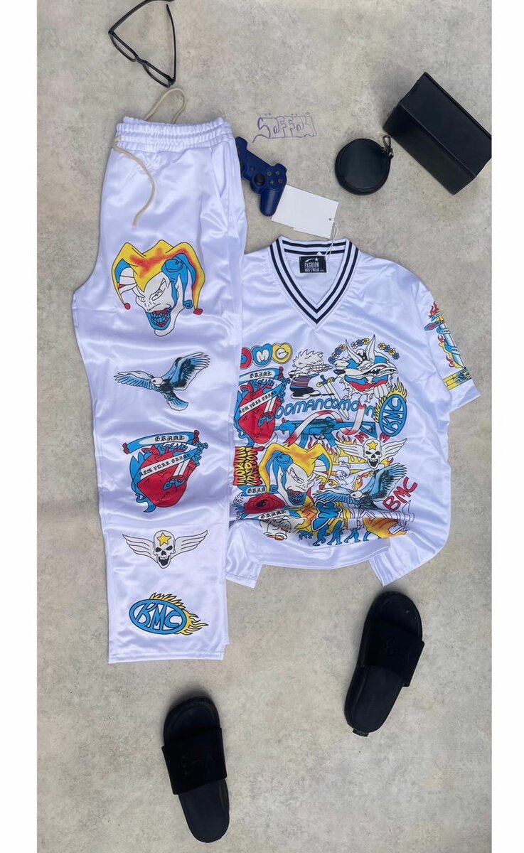 Cet ensemble de survêtement blanc avec des motifs colorés est parfait pour un look urbain et décontracté. Fabriqué dans un tissu confortable, il est idéal pour le sport ou le quotidien. Exprimez votre style unique avec ses designs audacieux.