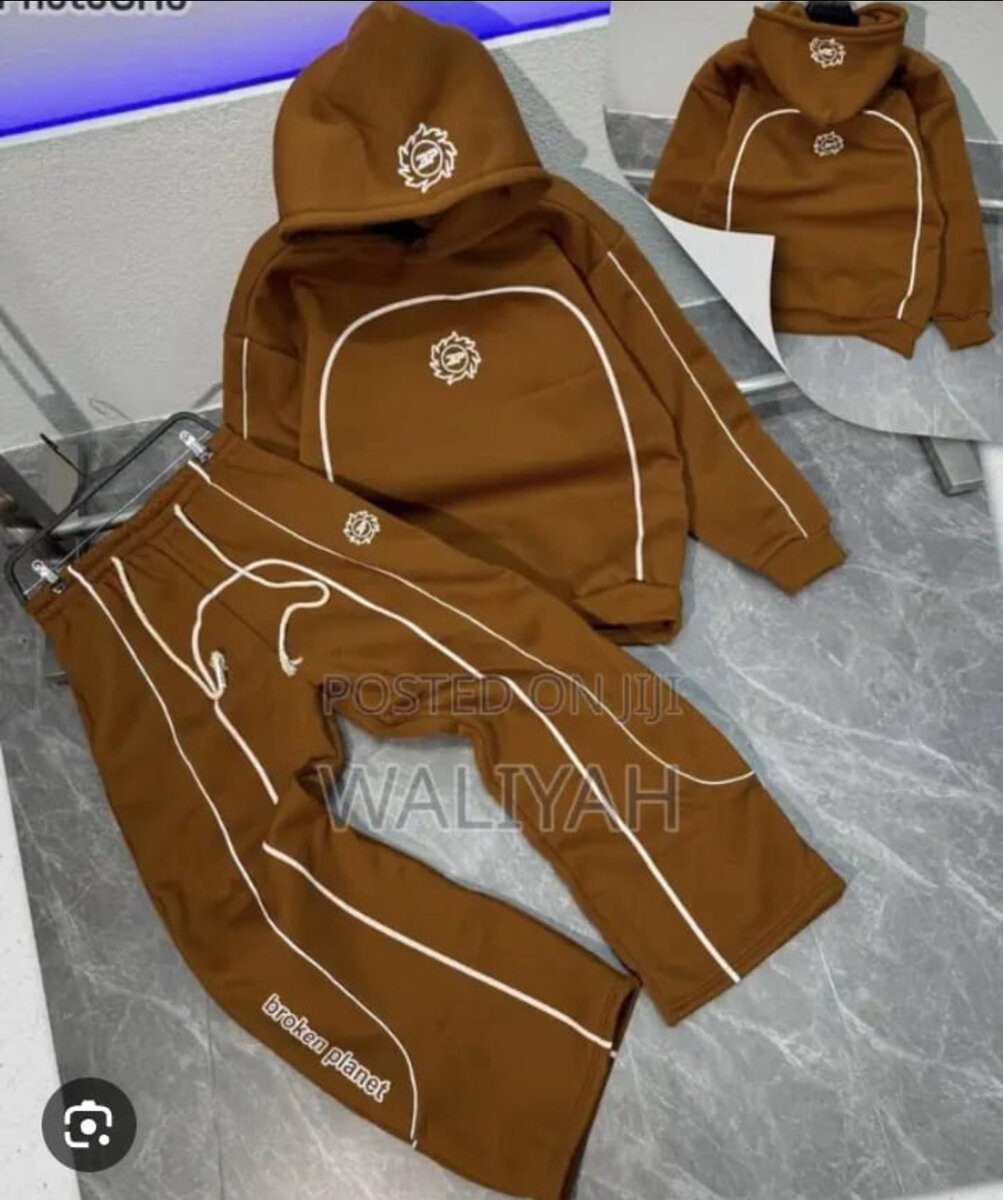 Confortable ensemble de survêtement marron avec capuche et détails blancs. Parfait pour le sport ou les loisirs, fabriqué avec un matériau doux et durable.
