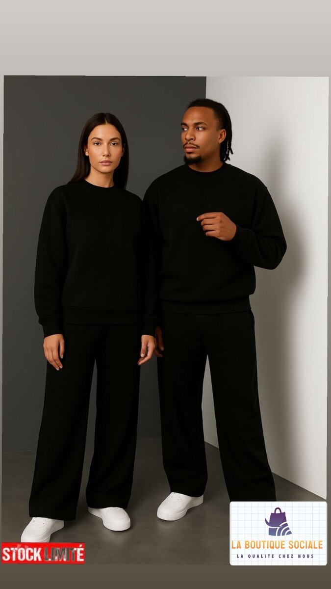 Découvrez cet ensemble de survêtement noir, parfait pour un look décontracté et élégant. Confortable et chic, idéal pour la détente ou le sport. Un choix polyvalent et moderne pour votre garde-robe.