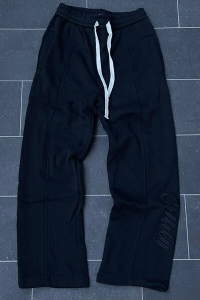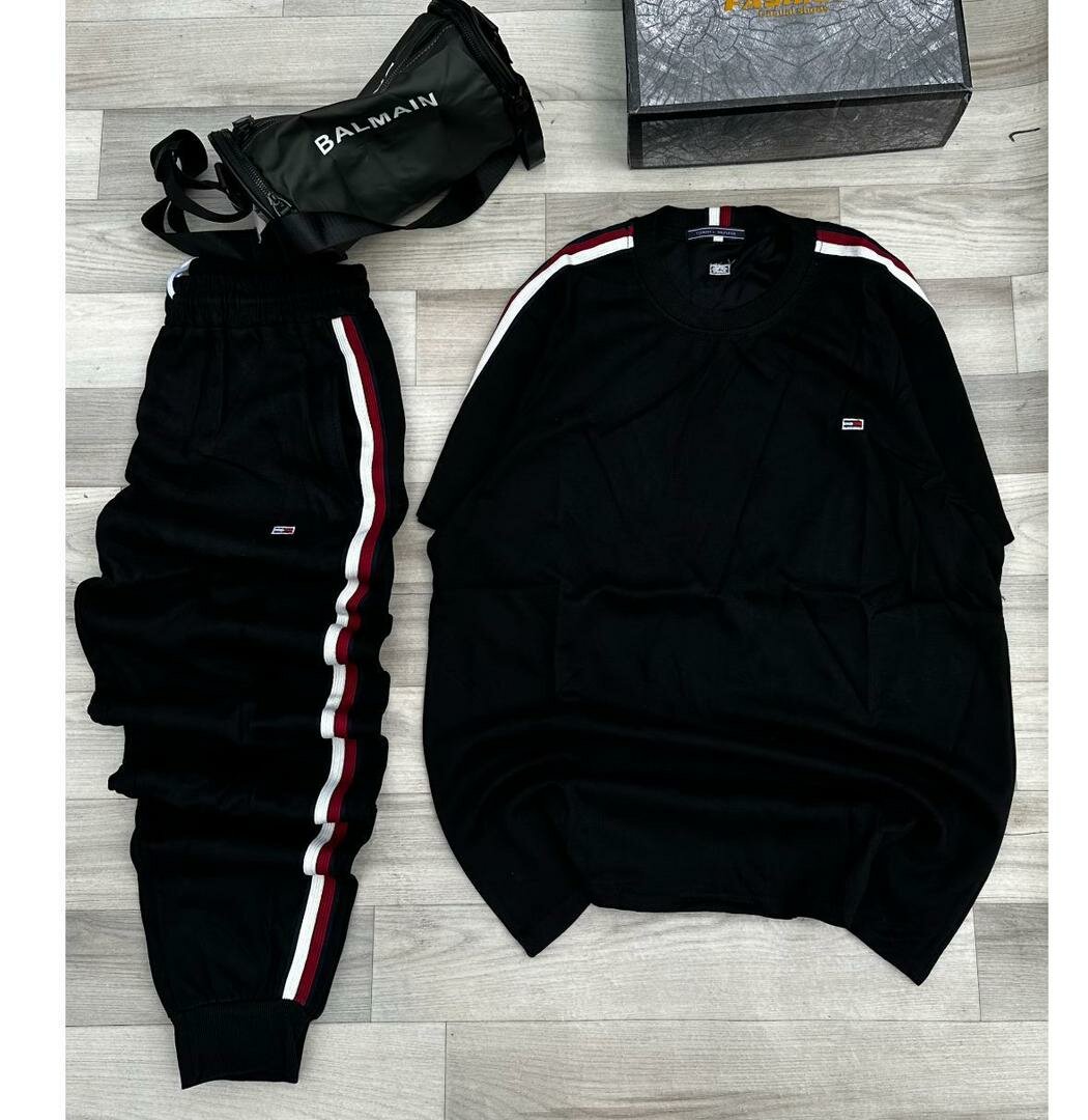 Ensemble de survêtement noir élégant avec bandes blanches et rouges. Idéal pour le sport ou les loisirs, allie confort et style. Parfait pour un look décontracté au quotidien.