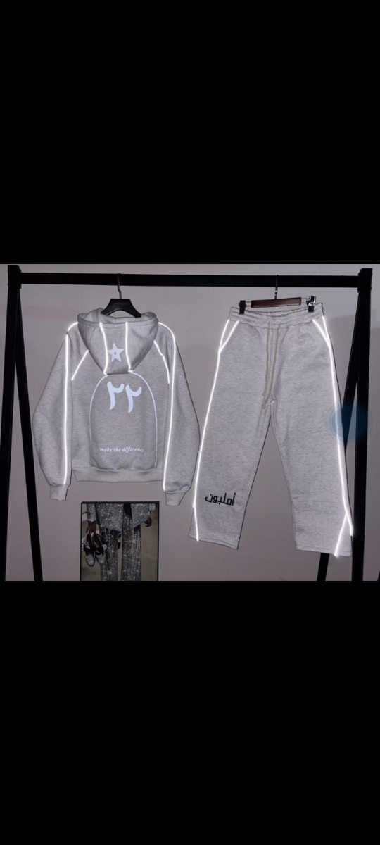 Découvrez cet ensemble de survêtement gris avec détails réfléchissants, idéal pour les activités sportives et les sorties décontractées. Confortable et stylé, il est parfait pour les saisons fraîches. Une tenue incontournable pour rester visible et tendance.