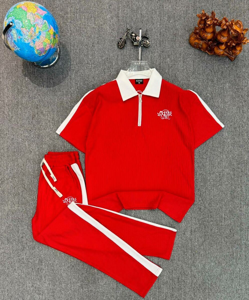 Cet ensemble de survêtement rouge et blanc est idéal pour un style sportif et décontracté. Fabriqué avec des matériaux confortables, il comprend un haut à col zippé et un pantalon assorti. Parfait pour les entraînements ou le mode décontracté du quotidien.