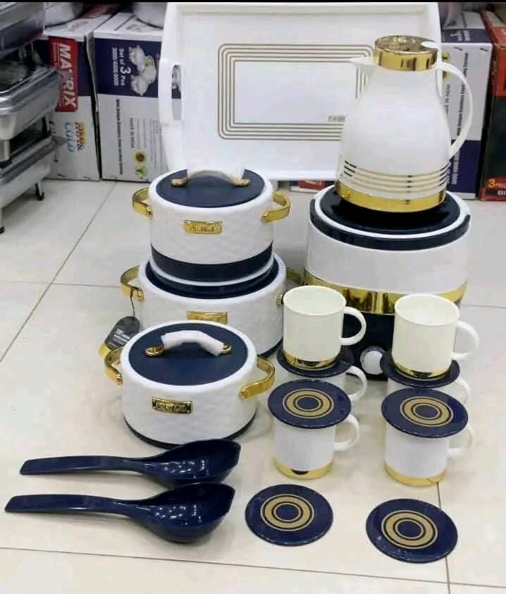 Élégant ensemble de service comprenant 15 pièces : 1 thermos, 1 plat à gratin, 2 casseroles, 4 tasses et 4 sous-tasses. Idéal pour un service à thé raffiné.