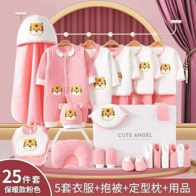 Adorable ensemble de 24 pièces pour bébé, incluant vêtements, chaussons, serviettes et accessoires, en rose doux avec motifs tigre. Parfait pour garder votre bébé au chaud et stylé.