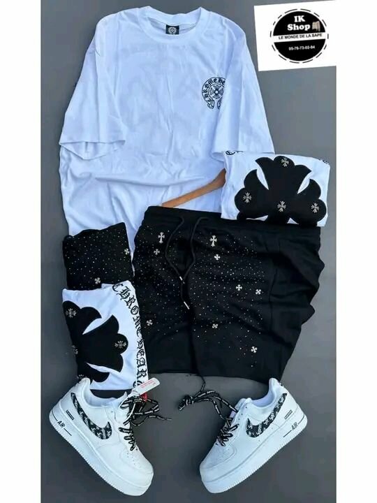 Ensemble de mode pour hommes comprenant un t-shirt blanc, un pantalon noir avec motifs et des chaussures blanches. Idéal pour un style urbain décontracté.