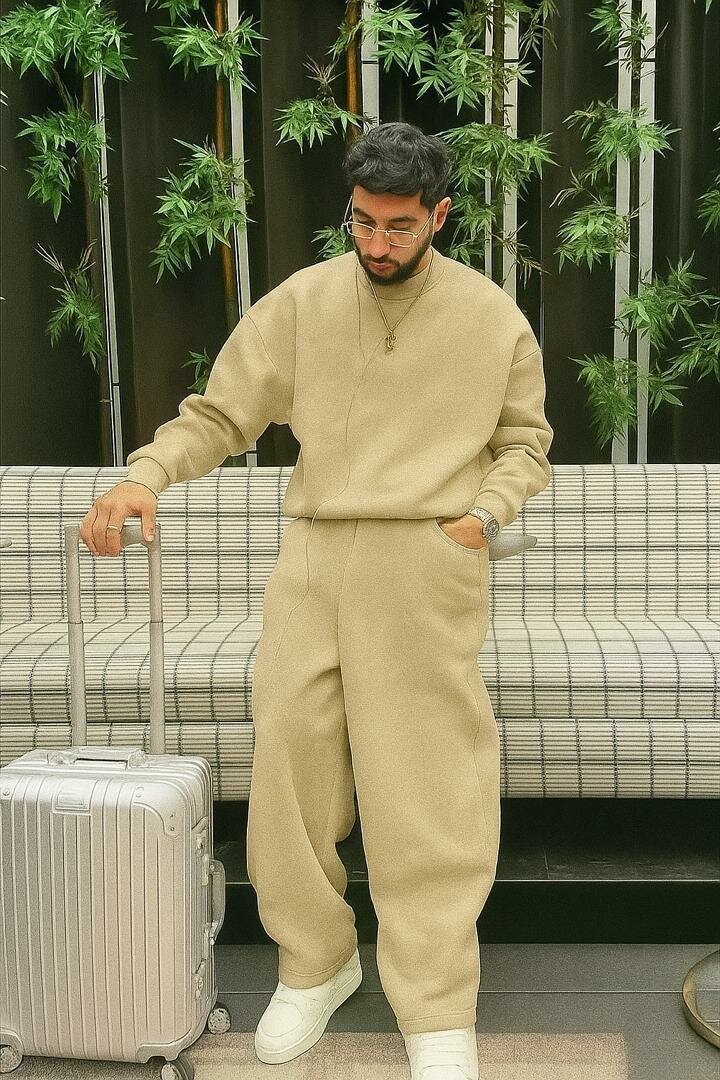 Cet ensemble de vêtements détente en beige est parfait pour voyager avec style et confort. Conçu avec des matériaux doux et respirants, il assure une aisance absolue pendant vos déplacements. Idéal pour les voyages longs, il peut être associé à des baskets pour un look décontracté complet. Ne manquez pas cette opportunité de voyager avec élégance et confort!