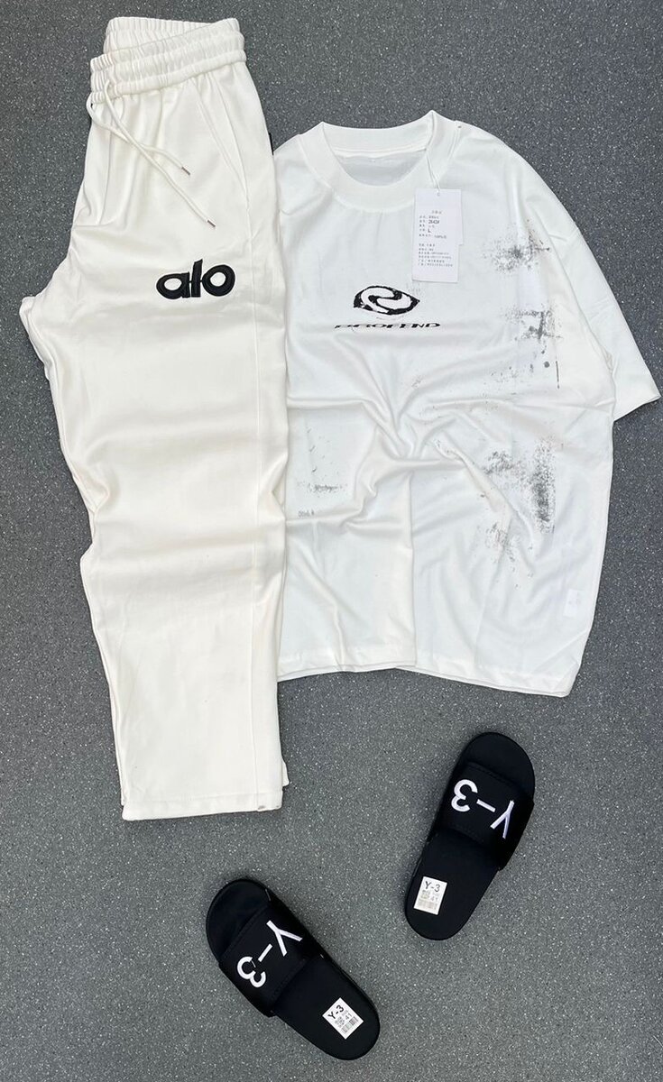 Optez pour cet ensemble décontracté parfait pour un look moderne et relax. Composé d'un t-shirt et d'un pantalon blanc, accompagné de sandales noires. Idéal pour la maison ou les sorties quotidiennes.