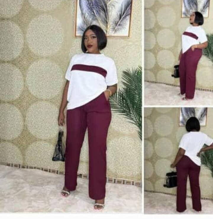 Élégant ensemble décontracté pour femme comprenant un t-shirt blanc avec bande contrastante et pantalon bordeaux. Idéal pour une tenue chic et relax au quotidien.