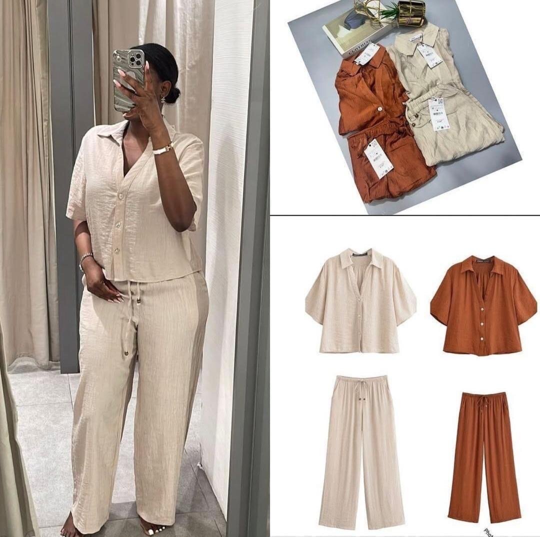 Découvrez notre ensemble décontracté en lin, parfait pour vos moments de détente ou sorties légères. Composé d'une chemise à manches courtes et d'un pantalon large, cet ensemble offre un confort ultime et une touche de sophistication. Idéal pour l'été, il permet à votre peau de respirer. Disponible en beige et brun orangé, il est facile à associer avec vos accessoires préférés. Choisissez-le pour un look à la fois élégant et décontracté.