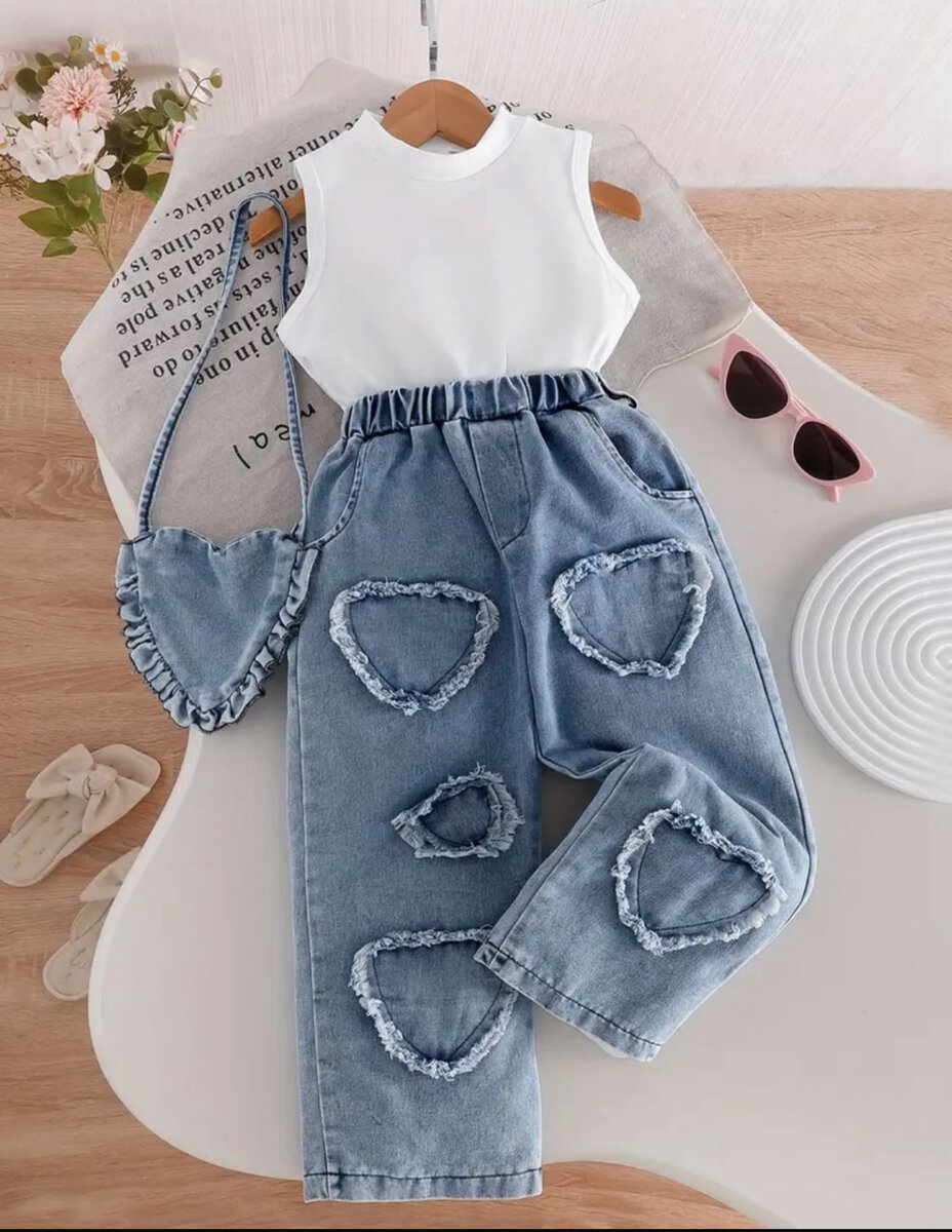 Adoptez ce charmant ensemble décontracté pour enfants comprenant un haut blanc élégant et un pantalon en jean orné de cœurs. Idéal pour une tenue stylée et confortable toute la journée. Parfait pour les sorties décontractées ou les événements spéciaux. Ajoutez une touche tendance avec le sac assorti et les lunettes de soleil!