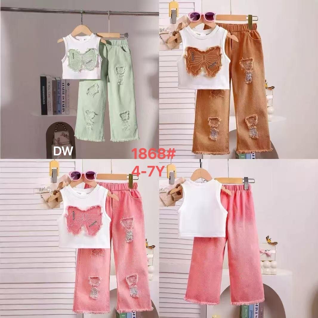 Adorable ensemble de vêtements pour enfants avec haut sans manches et pantalon déchiré. Conçu pour les filles de 4 à 7 ans, parfait pour les sorties estivales. Disponible en plusieurs couleurs vives.