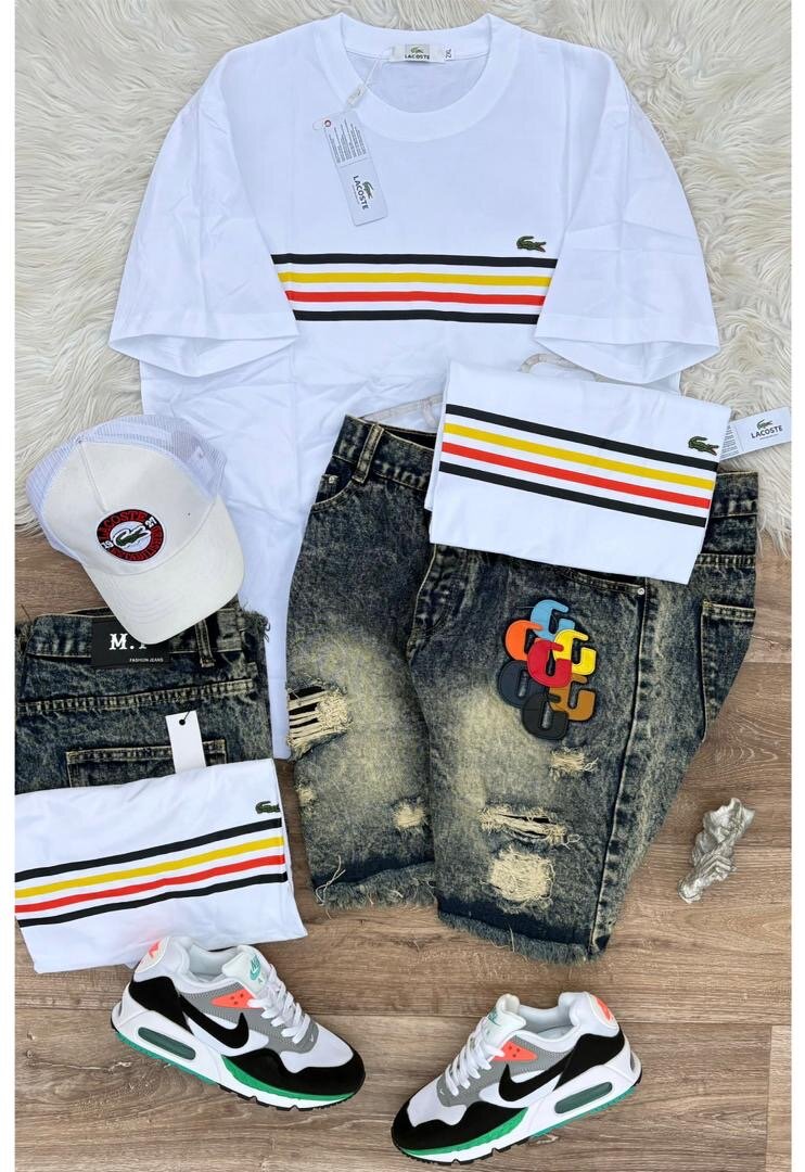 Optez pour ce look estival avec un t-shirt blanc à rayures colorées, un short en jean délavé et des baskets stylées. Parfait pour une journée décontractée ou une sortie entre amis. Complétez l'ensemble avec la casquette tendance incluse. Confort et style garantis!