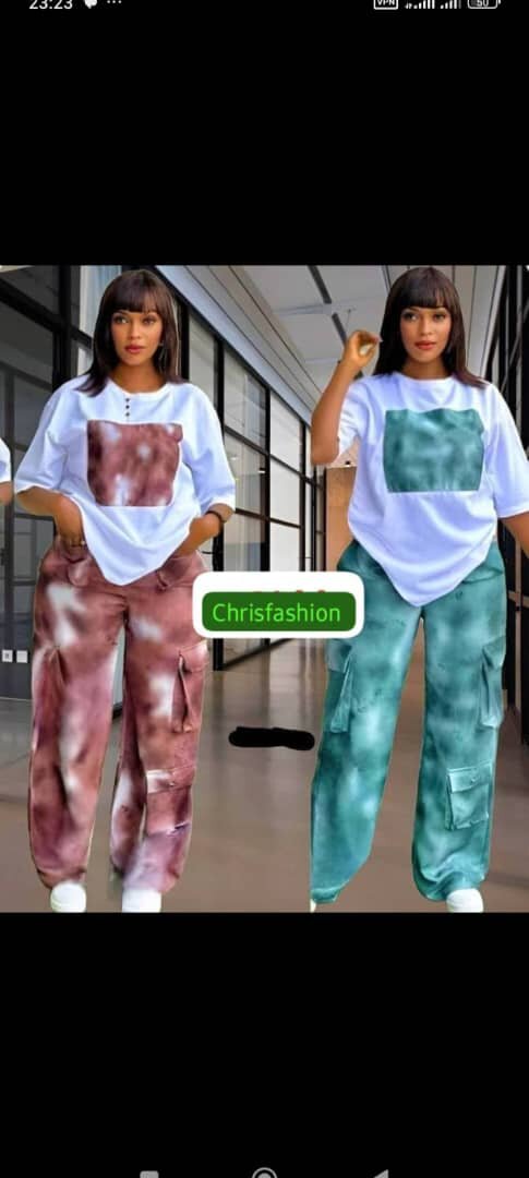 Ensemble décontracté pour femmes avec t-shirt imprimé et pantalon cargo tie-dye. Confort ultime et style moderne pour toute occasion décontractée. Parfait pour se démarquer avec élégance.