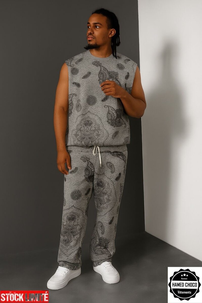 Découvrez cet ensemble décontracté à motif gris, parfait pour un look urbain et moderne. Confectionné dans des matériaux confortables, idéal pour vos sorties décontractées. Associez-le avec des baskets blanches pour compléter votre tenue.