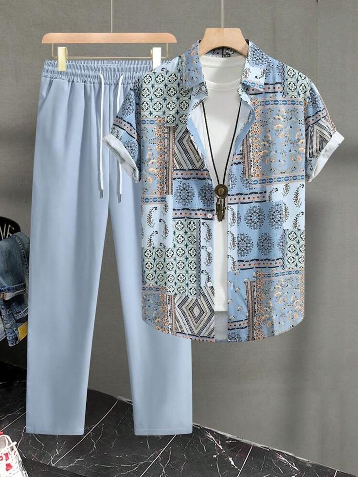 Explorez le style estival avec cet ensemble décontracté pour homme. Comprenant un t-shirt blanc basique, une chemise à motifs et un pantalon léger bleu, c'est l'option idéale pour un look relax tout en restant élégant. Parfait pour les sorties estivales ou les journées décontractées en ville.
