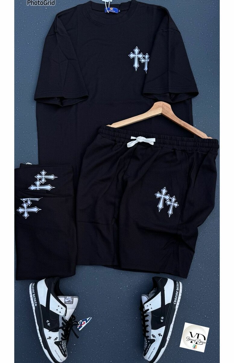 Ensemble décontracté pour homme, idéal pour un style urbain. Composé d'un t-shirt et d'un short assortis avec motif croix, disponible en plusieurs couleurs. Parfait pour la détente ou les sorties décontractées.