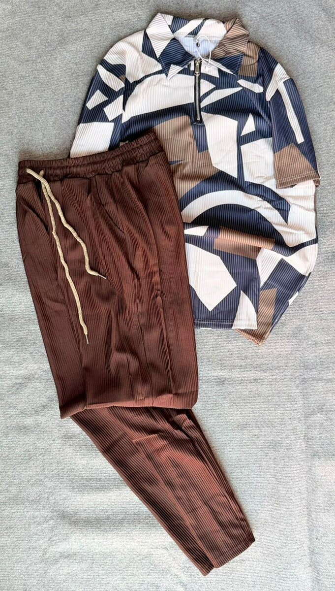 Transformez votre look avec cet ensemble décontracté pour homme. Le sweat à motifs géométriques et le pantalon marron apportent style et confort pour vos sorties. Idéal pour un weekend ou une journée détente.