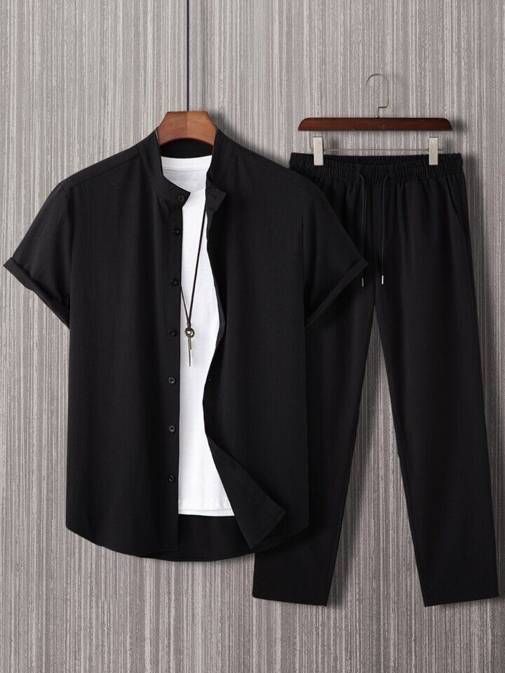 Parfait pour un look moderne et décontracté, cet ensemble noir pour homme comprend une chemise boutonnée élégante et un pantalon assorti. Idéal pour un usage quotidien ou un week-end décontracté. Confort et style assurés!