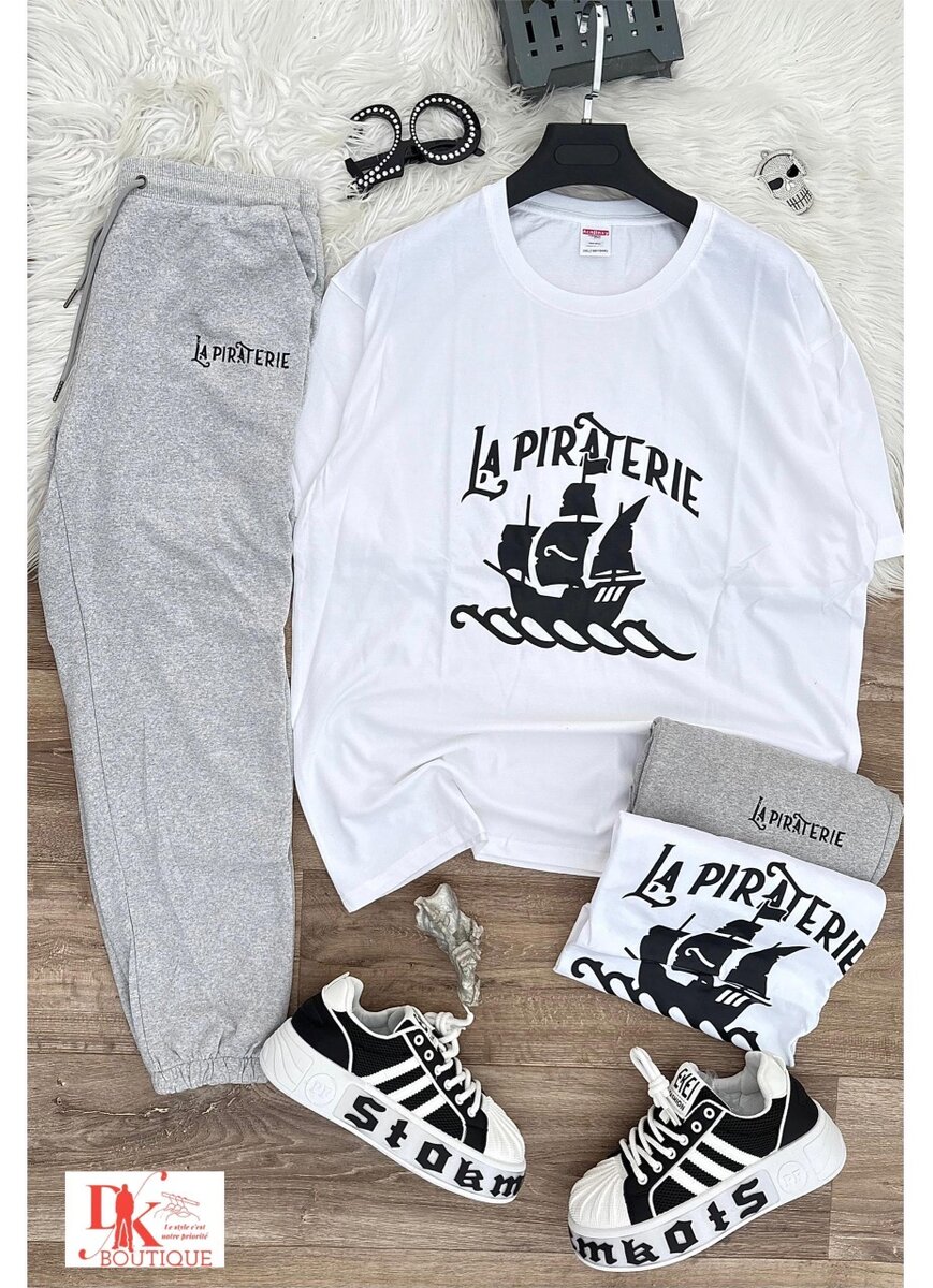 Découvrez l'ensemble décontracté La Piraterie : un t-shirt et un pantalon stylés pour un look unique. Parfait pour les sorties ou la détente à la maison. Fabriqué en matériaux confortables et durables. Chaussures assorties incluses pour compléter votre style.
