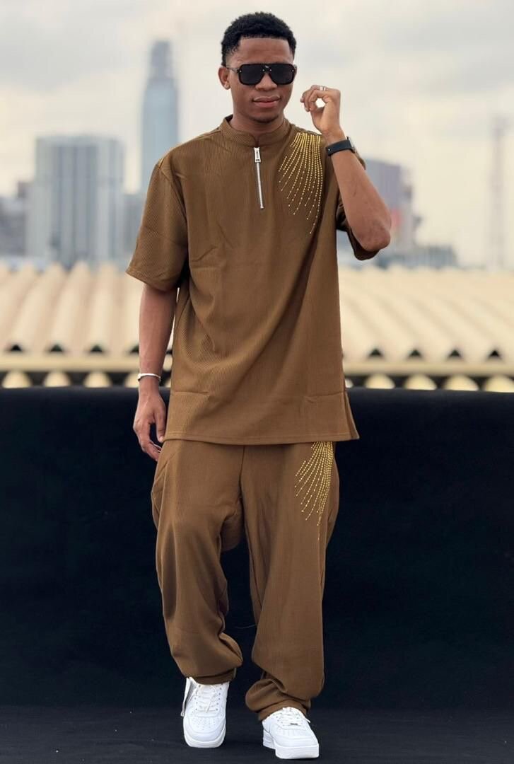 Adoptez un style chic et confortable avec cet ensemble marron, parfait pour les occasions décontractées ou pour se détendre en ville. Composé d'un haut à manches courtes avec fermeture éclair et de pantalons assortis, cet ensemble se distingue par ses détails subtils sur l'épaule et la jambe. Offrez-vous le confort tout en restant tendance!