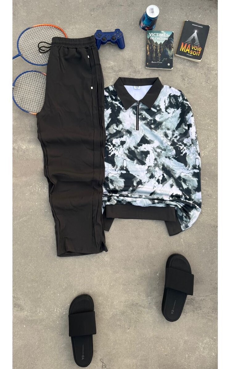 Découvrez cet ensemble décontracté et tendance composé d'un polo imprimé artistique, un pantalon confortable et des sandales stylées. Idéal pour un look moderne et relax, que ce soit pour des sorties en ville ou pour des moments de détente entre amis.