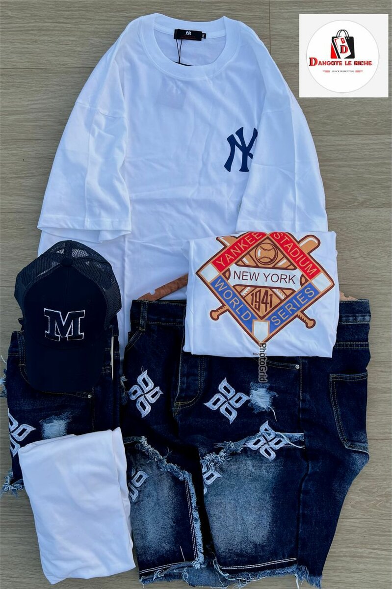 Look moderne avec t-shirt imprimé New York, short en denim déchiré et casquette stylée. Idéal pour les sorties décontractées ou loisirs urbains. Montrez votre passion pour le sport tout en restant à la mode. Parfait pour les amateurs de baseball et de style vintage.