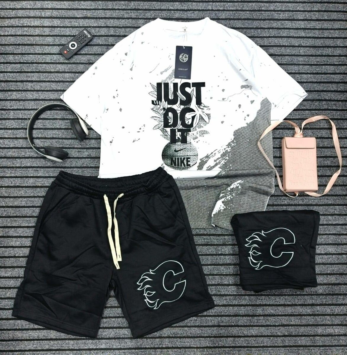 Ce superbe ensemble Nike comprend un t-shirt blanc avec un imprimé accrocheur et un short noir confortable. Parfait pour une journée décontractée ou une séance d'entraînement, ce set offre style et confort. Ajoutez une touche sportive à votre garde-robe d'été!