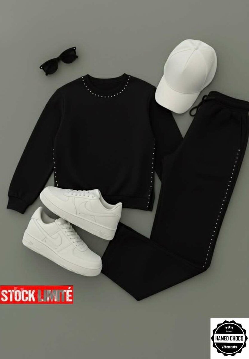 Un ensemble élégant comprenant un sweat noir, un pantalon assorti, des baskets blanches et une casquette. Parfait pour un look urbain et moderne. Confortable et tendance.