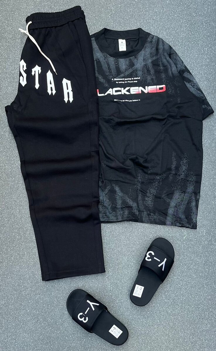 Découvrez cet ensemble casual noir pour homme, parfait pour une journée relaxante. Comprend un t-shirt à imprimé moderne et un pantalon confortable. Complétez le look avec des sandales stylées. Idéal pour le confort au quotidien.