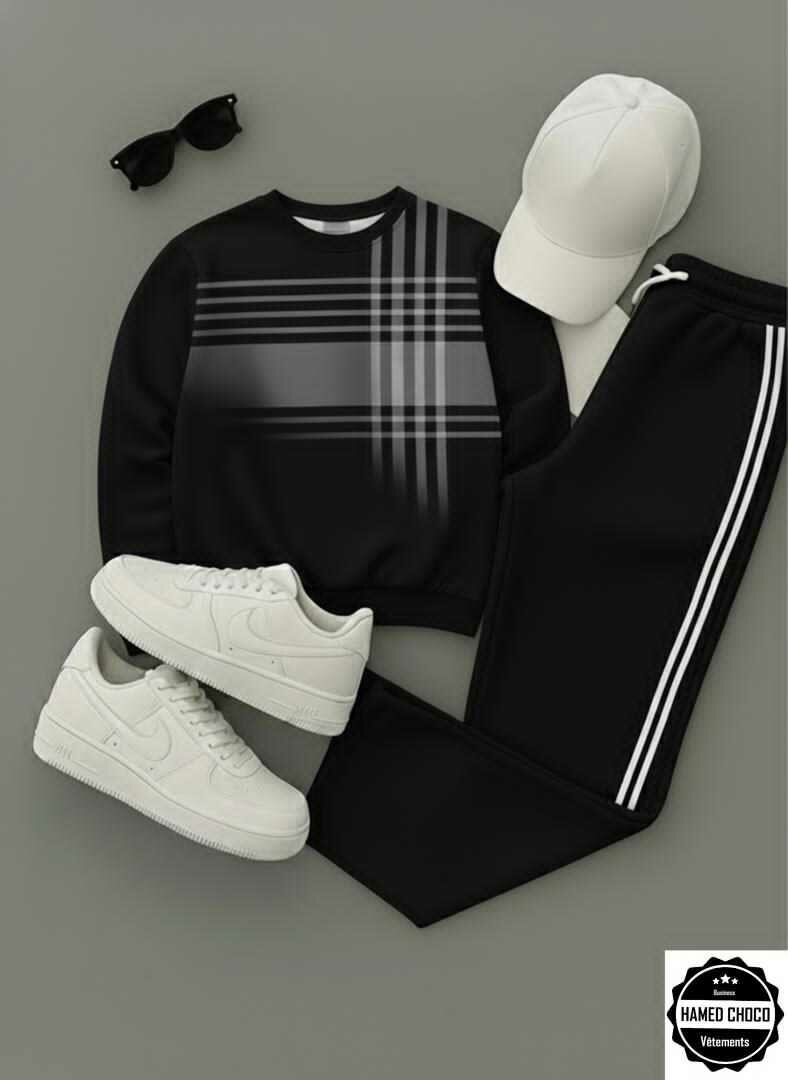 Découvrez cet ensemble décontracté pour homme, idéal pour le sport et les sorties relaxantes. Comprend un sweatshirt à motifs modernes, pantalon de jogging à bandes, casquette stylée et sneakers confortables. Parfait pour un look tendance et confortable au quotidien.