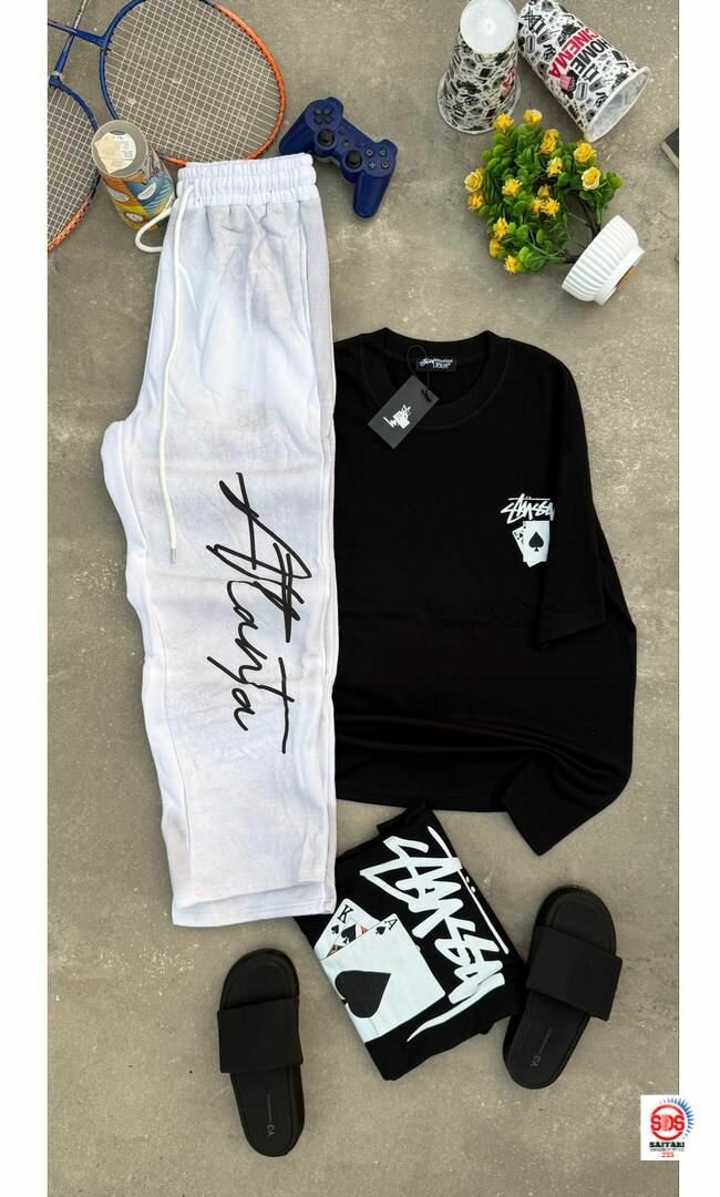 Optez pour cet ensemble décontracté et stylé, parfait pour les sorties urbaines ou les moments de détente à la maison. Composé d'un t-shirt noir avec imprimé moderne et d'un pantalon confortable, il offre une allure chic et décontractée. Complétez le look avec des tongs et soyez prêt à impressionner.