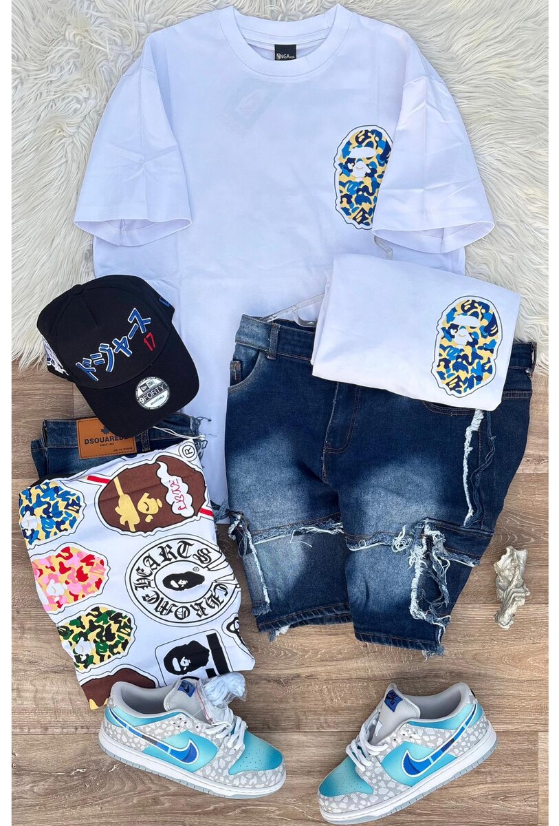 Parfait pour un look streetwear, cet ensemble comprend un t-shirt blanc graphique, un short en jean déchiré, une casquette stylée et des sneakers vibrantes. Idéal pour les sorties décontractées et les promenades en ville.