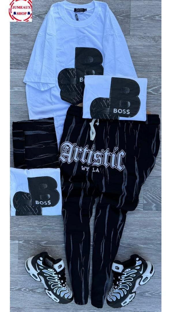 Découvrez notre ensemble de vêtements décontractés pour hommes composé d'un t-shirt et pantalon imprimés. Confort et style s'associent à des motifs artistiques uniques. Idéal pour un look moderne au quotidien. Exprimez votre style avec cette tenue parfaite pour les sorties ou les moments de détente.