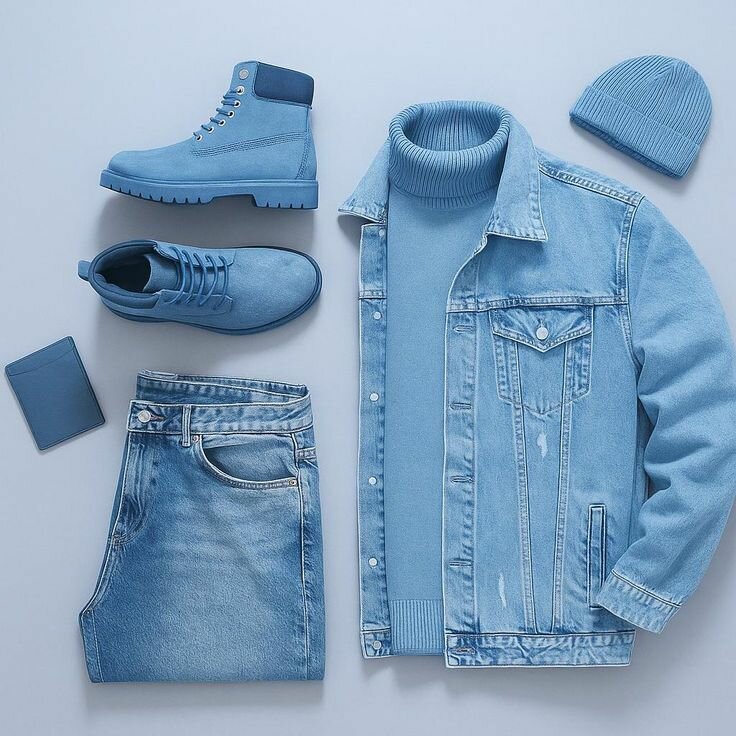Stylez-vous avec cet ensemble denim bleu : veste robuste, pull chaud, jeans iconiques, bottines stylées. Parfait pour un look moderne et audacieux!