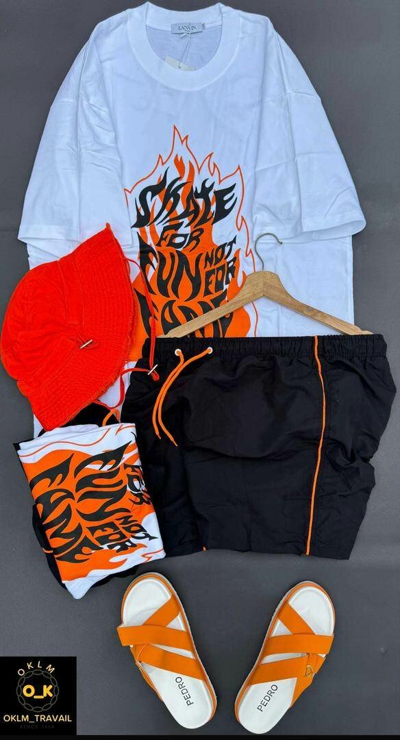 Adoptez un style estival audacieux avec cet ensemble unisexe vibrant. Comprenant un t-shirt graphique, un short confortable et des sandales assorties, cet ensemble est parfait pour les journées décontractées au soleil. Le chapeau inclus offre une protection stylée contre le soleil. Idéal pour les sorties à la plage ou les promenades décontractées en ville, ce look est à la fois tendance et pratique.
