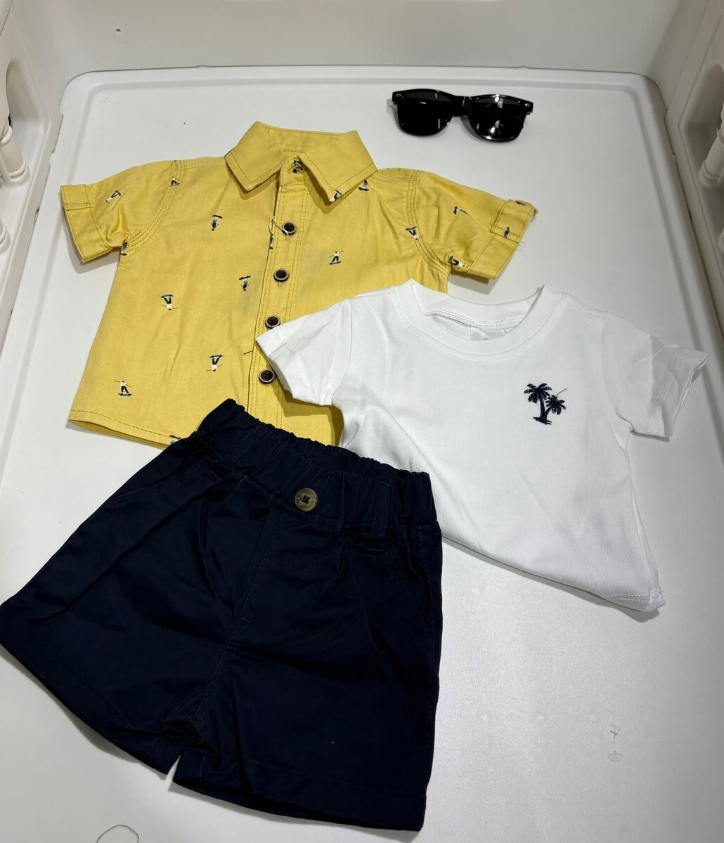 Cet ensemble élégant pour garçons comprend une chemise à manches courtes, un t-shirt blanc avec motif palmier et un short confortable. Idéal pour les sorties estivales ou les événements décontractés. Associez-le avec des lunettes de soleil pour un look branché et ensoleillé.