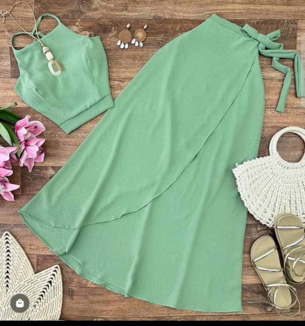Adoptez un style estival chic avec cet ensemble vert composé d'une jupe longue fluide et d'un haut à bretelles. Idéal pour une promenade sur la plage ou une soirée décontractée. Fabriqué dans un tissu léger et respirant pour un confort optimal. Accessoirisez avec des sandales et un sac en paille pour un look naturel.