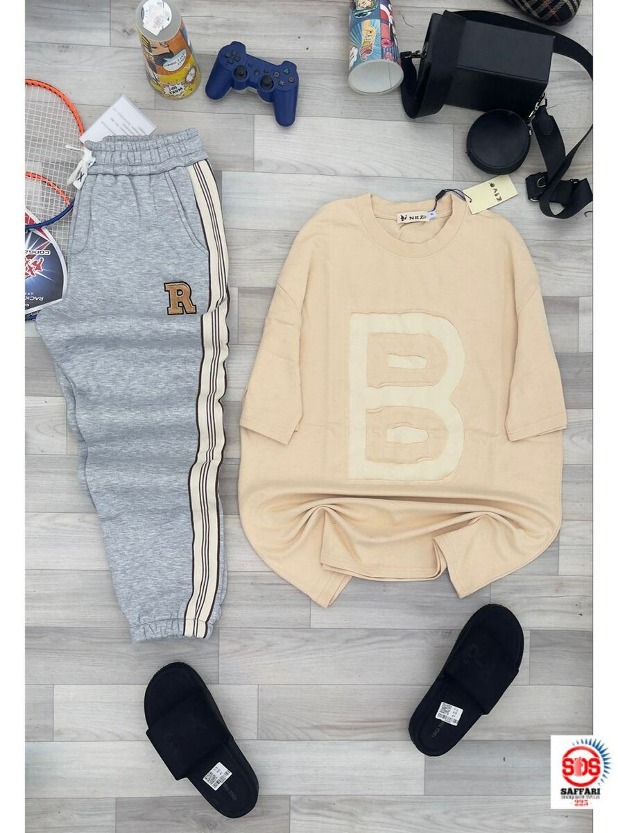 Ensemble confortable de détente, idéal pour la maison ou le sport. Comprend un pull beige et un pantalon en jogging gris avec une bande stylée. Parfait pour un look relax et décontracté.
