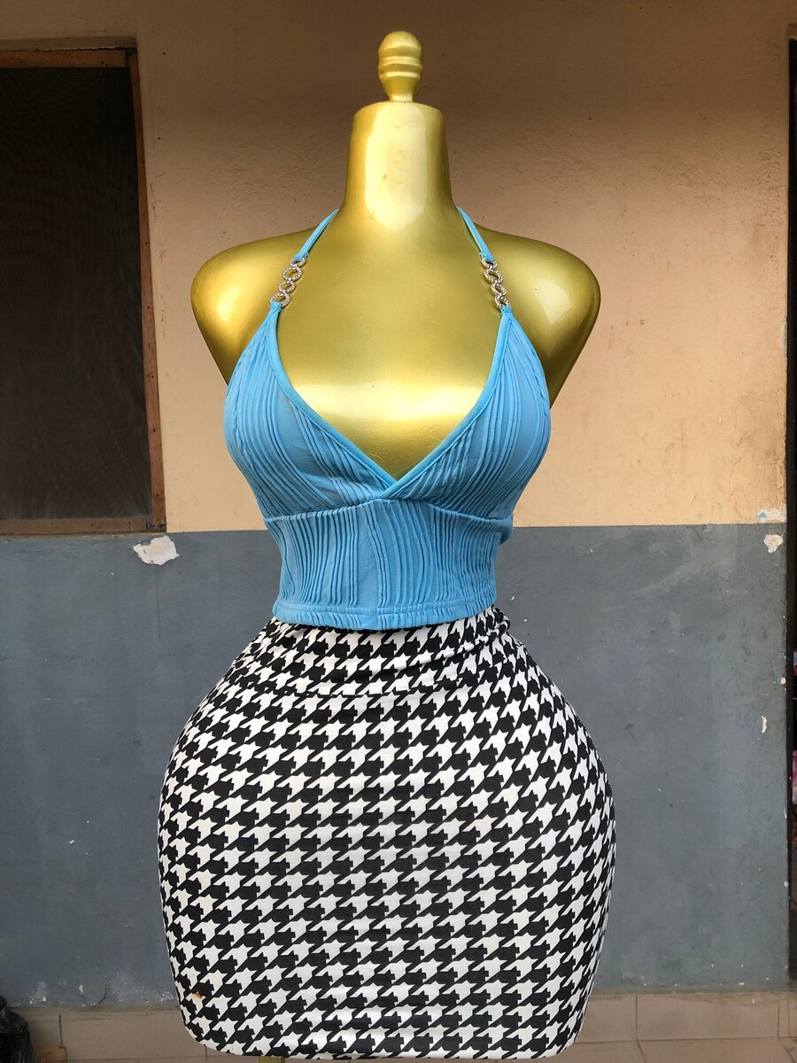 Découvrez ce d'ensemble un haut bleu croisé et une jupe à motif pied-de-poule noir et blanc. Idéale pour une soirée stylée ou une sortie entre amis, elle mettra en valeur votre silhouette avec sophistication.