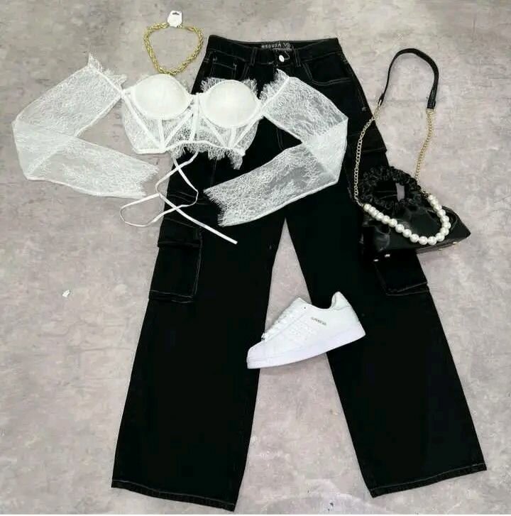 Découvrez cet ensemble chic composé de jeans cargo noirs, d'un soutien-gorge blanc en dentelle, d'un haut en dentelle, de baskets blanches et d'un sac à main noir orné de perles. Idéal pour les femmes cherchant un look moderne et tendance.