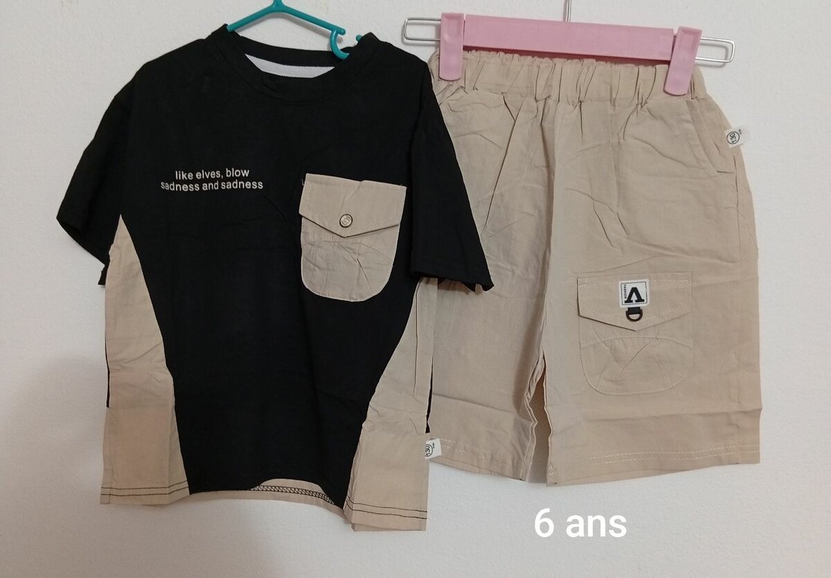 Découvrez cet ensemble moderne pour enfant de 6 ans, comprenant un t-shirt noir avec des poches contrastées et un short beige pratique.