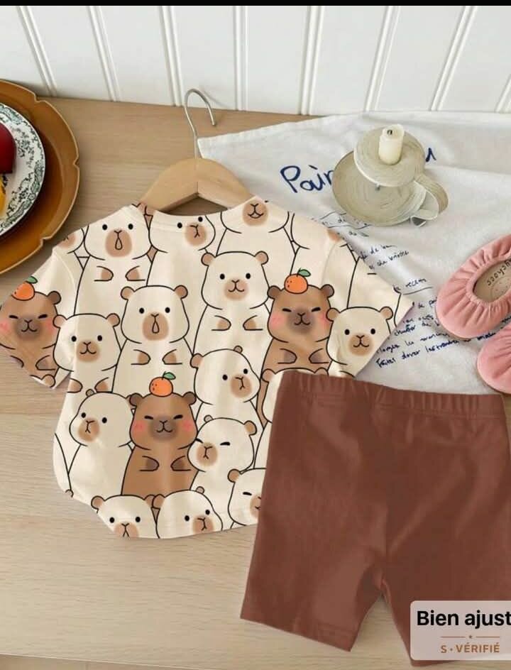 Adorable ensemble pour enfants avec un t-shirt imprimé d'oursons et un short marron confortable. Parfait pour le quotidien ou les sorties, cet ensemble garantira style et confort.