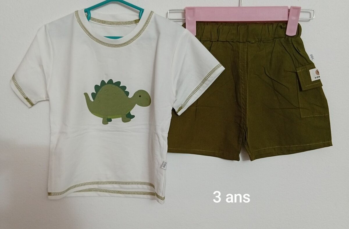 Ensemble adorable pour enfant de 3 ans avec t-shirt dinosaure et short kaki. Idéal pour un style décontracté et ludique. Parfait pour le quotidien et les sorties en plein air.