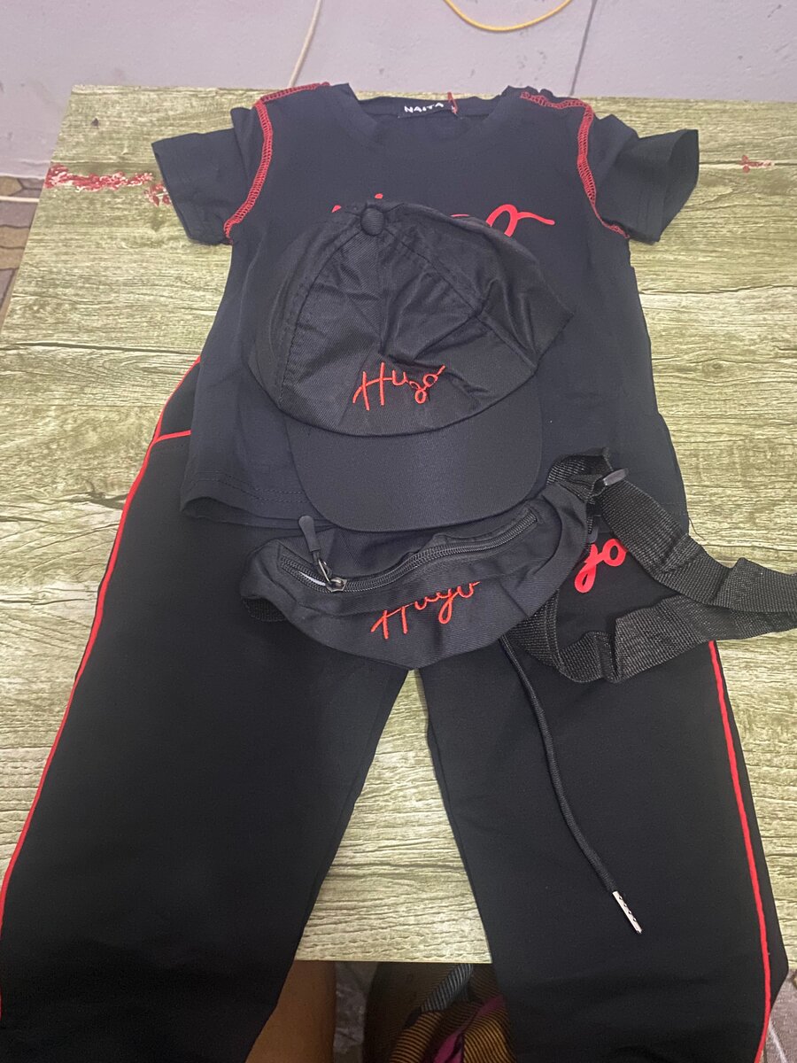 Ensemble stylé pour enfants comprenant un t-shirt, un pantalon, une casquette et une banane. Confortable et tendance, parfait pour les activités quotidiennes ou les sorties décontractées. Design moderne avec des détails rouges contrastants. Un choix idéal pour un look cool et urbain!