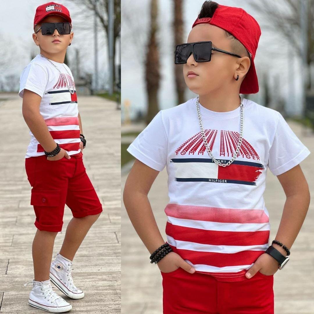 Ensemble stylé pour garçons avec t-shirt à motifs et short rouge vif. Idéal pour un look décontracté et tendance. Confort garanti, parfait pour les sorties ou les occasions spéciales. Style urbain et moderne pour votre petit aventurier.