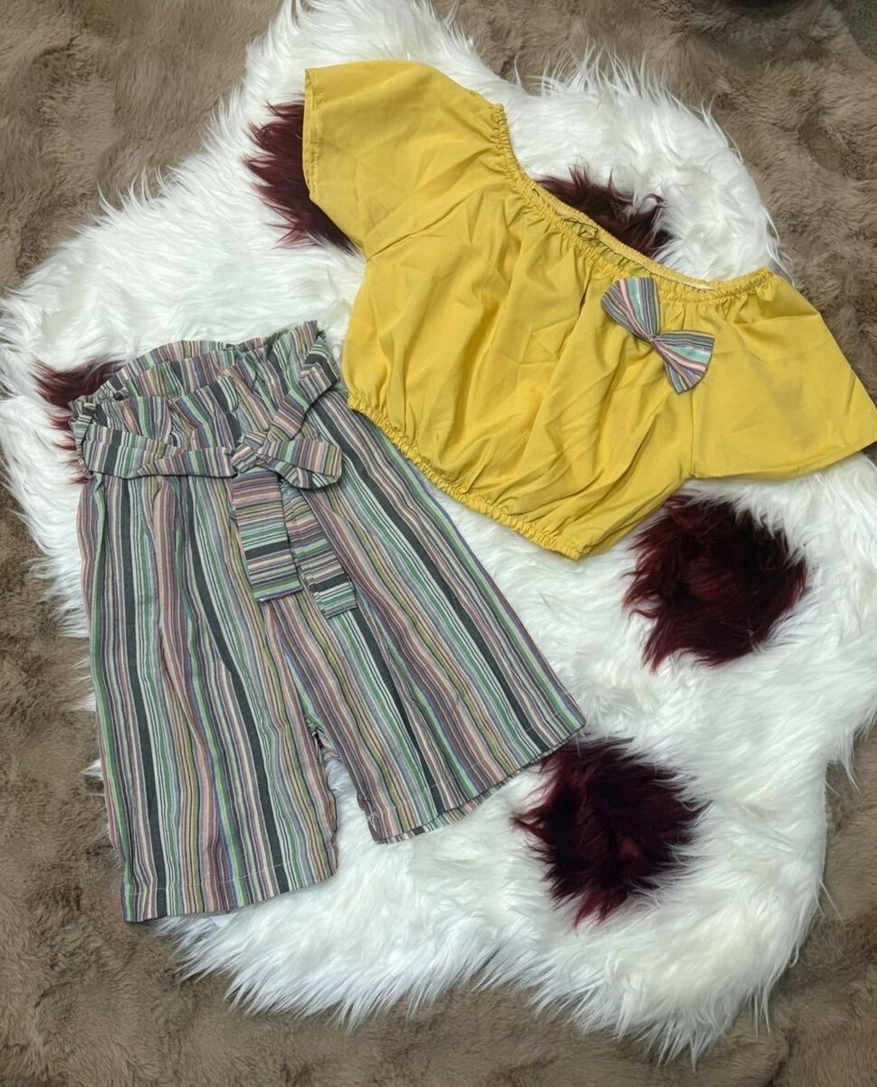 Craquez pour cet ensemble adorable composé d'un haut jaune vif à épaules dénudées et d'un short rayé coloré. Parfait pour les jolies journées ensoleillées, ce look est idéal pour un style à la fois décontracté et tendance. Un choix excellent pour les petites exploratrices pleines de vie! Enfant 6 ans , 4ans ,5ans
